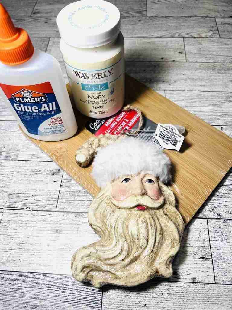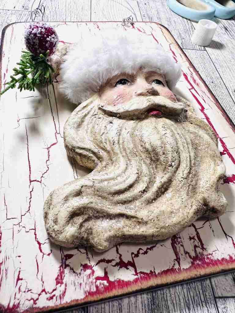 Finally I’m ready to add the Santa and a bow. The Santa had a hook on top so I removed it and then used hot glue along with E-6000 to adhere it to the board. So pretty!