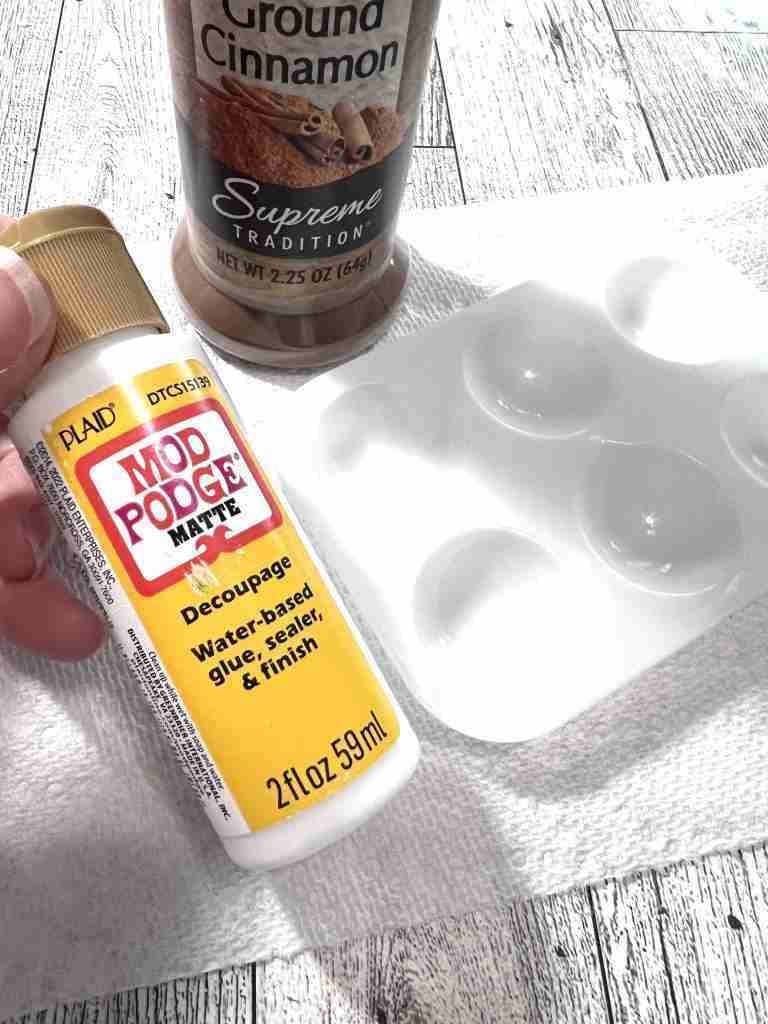 I’ll brush a layer of Mod Podge onto the palette and then sprinkle on the cinnamon. Then dab Mod Podge on top again, repeating the process. I’ll get the best results when I allow the first layer to dry a bit.