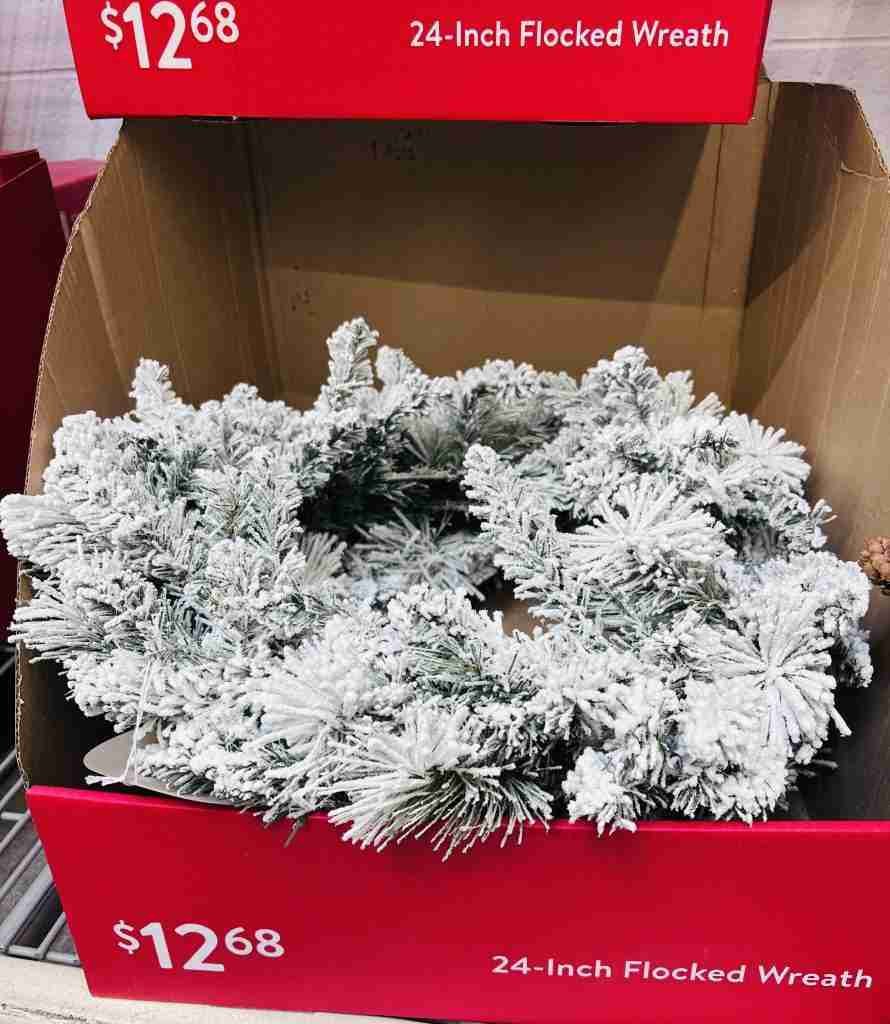 On the top of my list is greenery, since I love snagging it at a low, low price to use next year! I’ll pick up these two flocked wreaths for about $6.30 each. I’ll buy two for the price of one at the regular price. BUT, I also spot the pretty lamb’s ear wreath for $10.00 and it can definitely be used year round!! Score!!