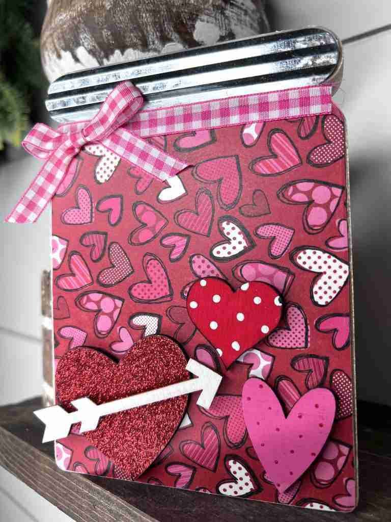 I don’t know about you, but my crafting stash is FULL of pieces that I consider good surfaces. I picked this particular surface up last year in the spring knowing it would be perfect for a DIY project and today I’m transforming it into a fun Dollar Tree mason jar Valentine!