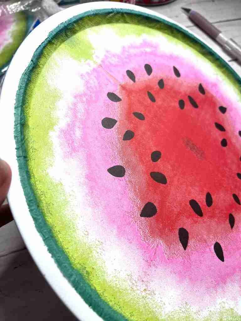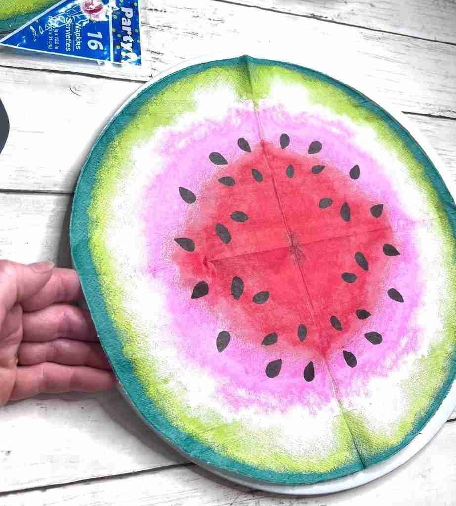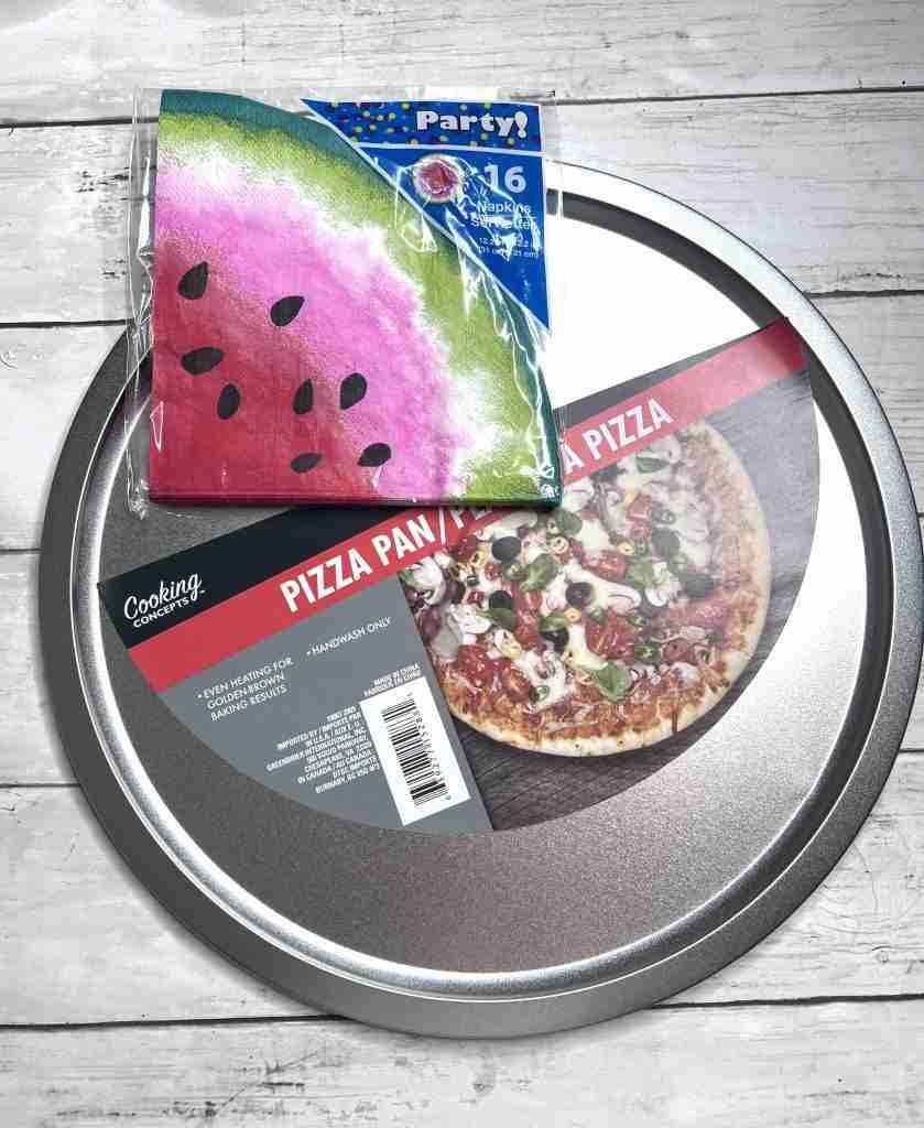 First up be sure to grab a pizza pan and a pack of these watermelon napkins from Dollar Tree. There’s a few more items we’ll be using and I’ll share that list below.