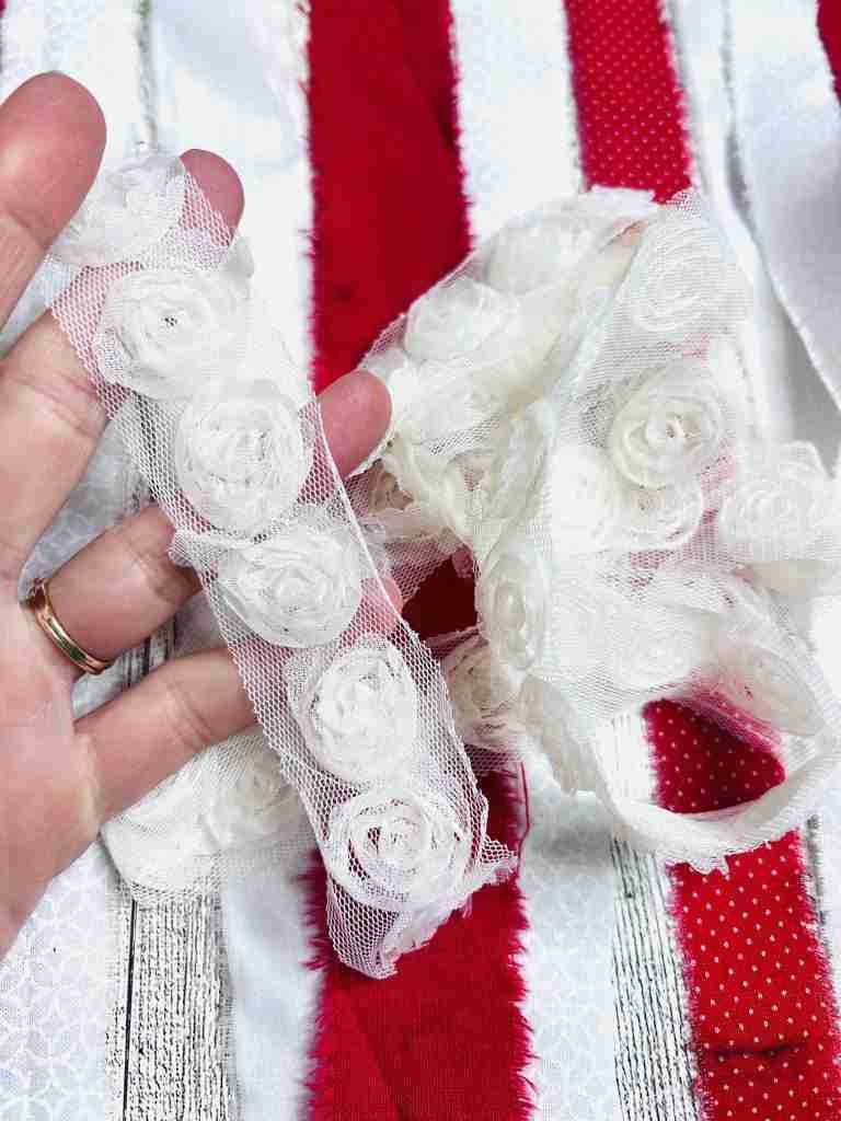 Next, I’m wanting a little more texture and variation, so I’ll add strips of some different ribbons from Walmart.