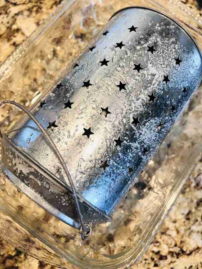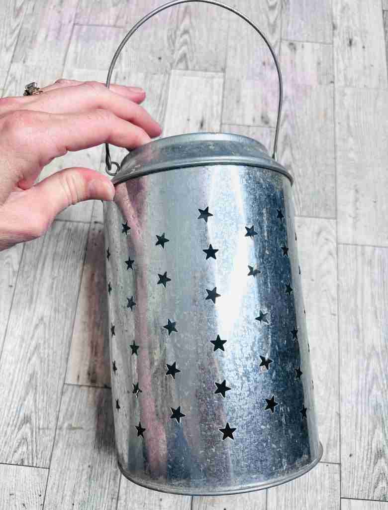 Next, I grabbed this solar light from Dollar Tree to use inside our lantern with the easy rust technique. The light shining through all those little stars will be so pretty!! It was a little tall to fit inside, so I removed the bottom metal piece.