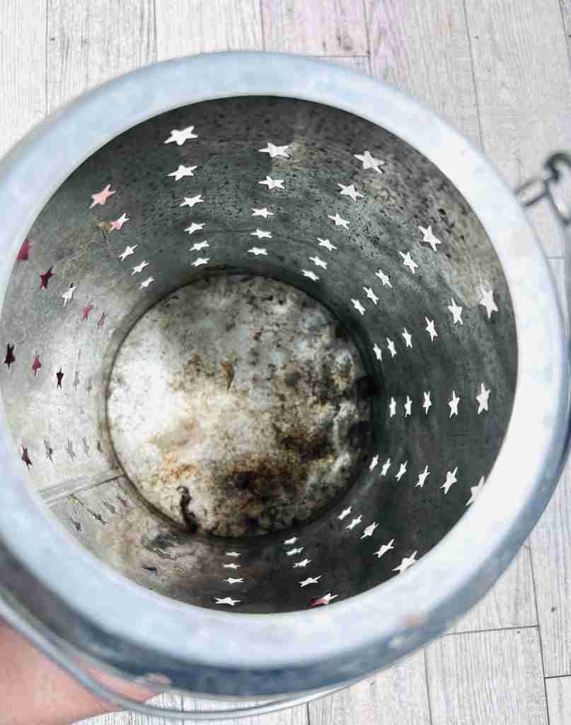 I picked up this lantern at Goodwill for .99 cents and thought it would be perfect for backyard decor, especially on the Fourth. You can see in the picture below that it has some rust inside, but I’d like to add some rust to the outside too!
