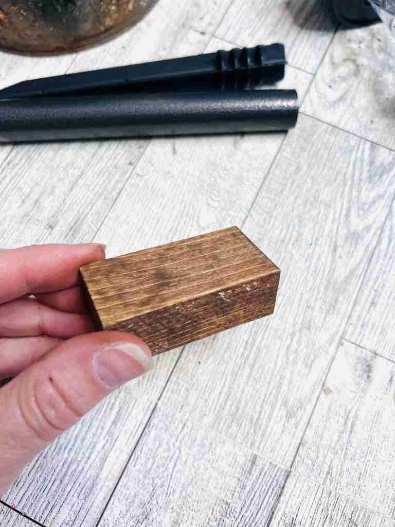 I want to raise the light up just a bit, so I’ll glue it to a piece of wood with E-6000 and then glue the wood piece to the bottom of the lantern.
