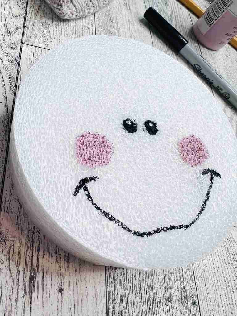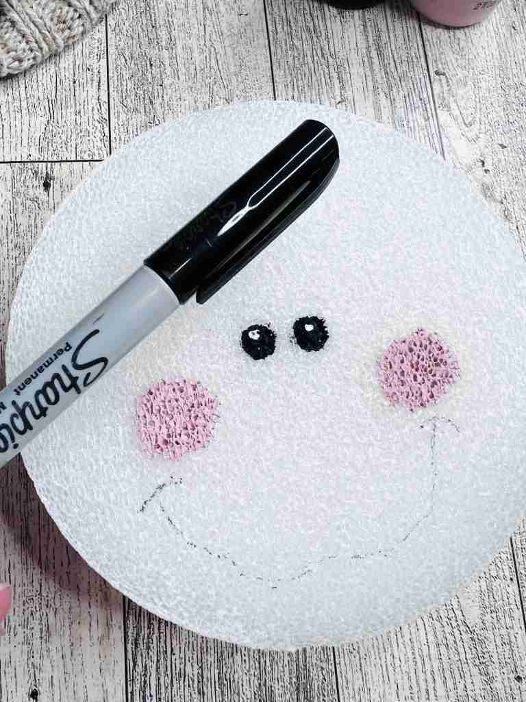 Now, add rosy cheeks using pink paint and sketch a mouth using a pencil or Sharpie. Once the mouth is how you want it, paint over the line with black paint.