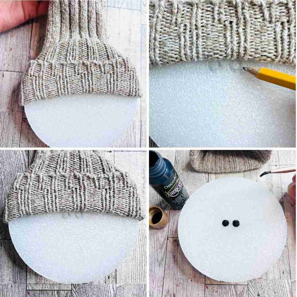 Next, pull the sock over the top of the discs to get an idea of where the eyes need to go. I want mine to set just below the hat rim. Use a pencil to mark the spots and then paint them black with paint.