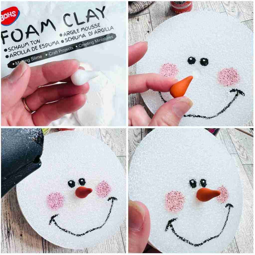 Finish off the face by adding a nose to the Dollar Tree Snowman Ornament. I’m using a small amount of air dry clay to sculpt a nose, paint, and the attach with hot glue. For the nose you could use the end of a larger skewer or toothpick as well.