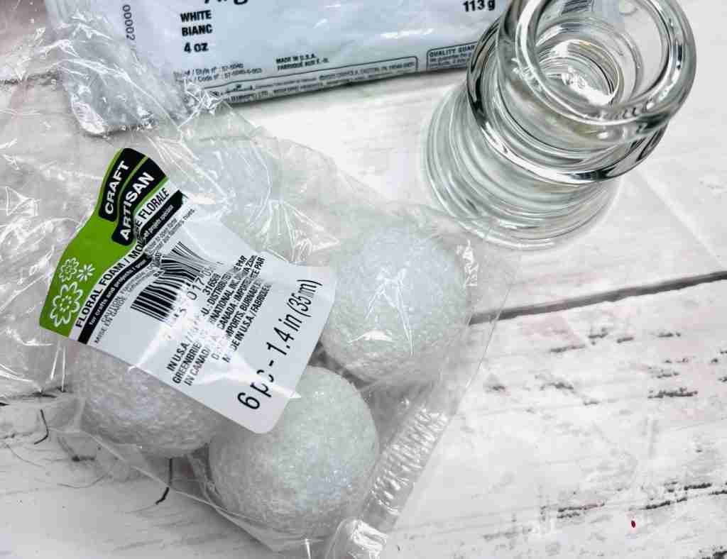 First, let’s go over the supplies needed for this easy project. We’ll need a floral foam ball (1.4″) from Dollar Tree, a small glass candle holder from Dollar Tree, and some air dry clay. I’m using Modelite clay for this project.