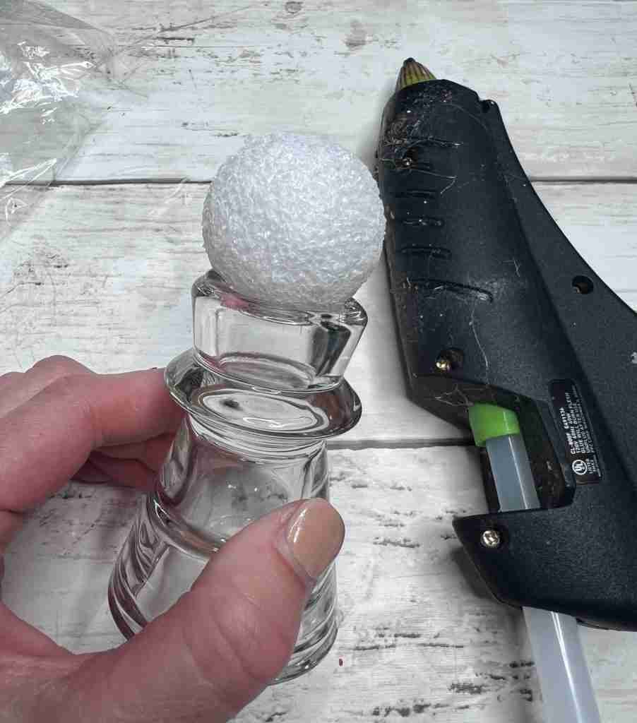 Next, use hot glue or another permanent glue to attach the foam ball to the top of the candlestick.
