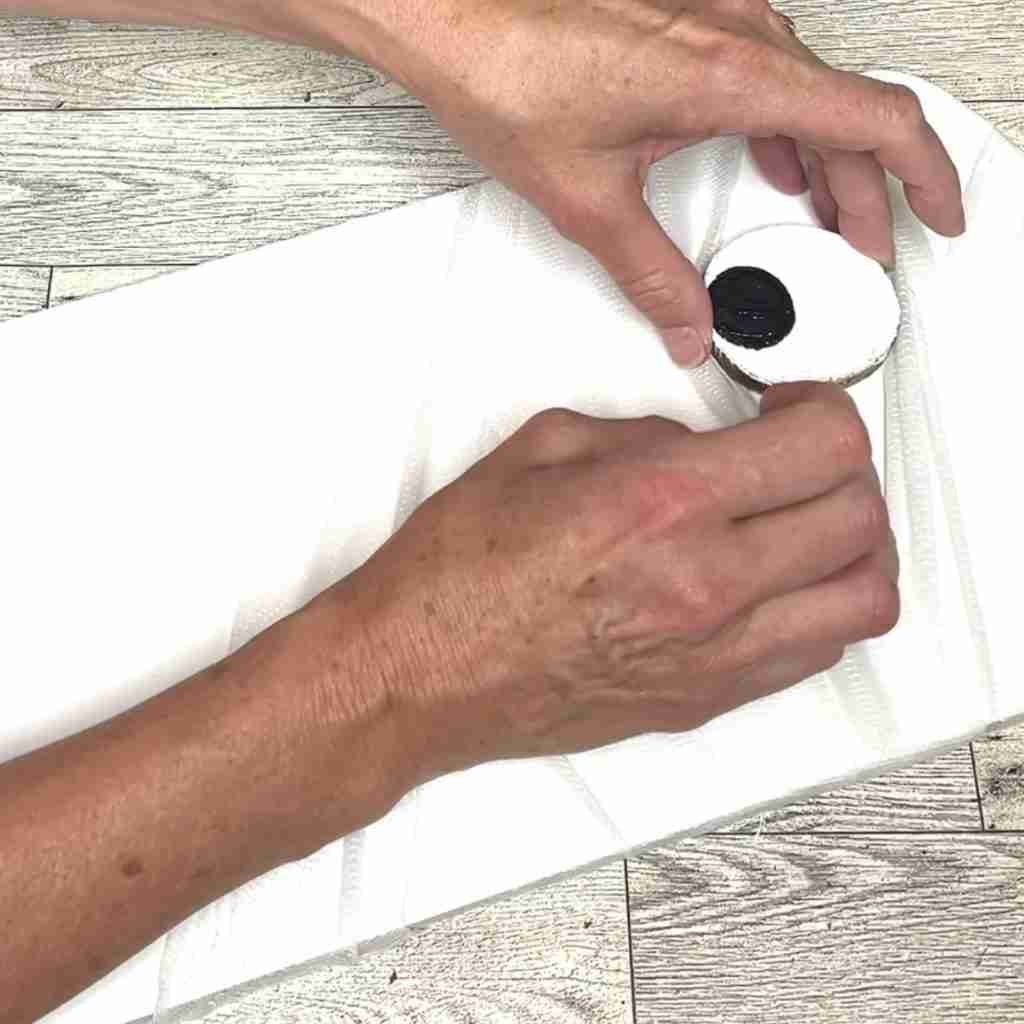 When the roll is wrapped around the board I’ll use two wood rounds (mine are different sizes) that have been painted to look like eyes using white and black paint. Use hot glue to secure them to the board.