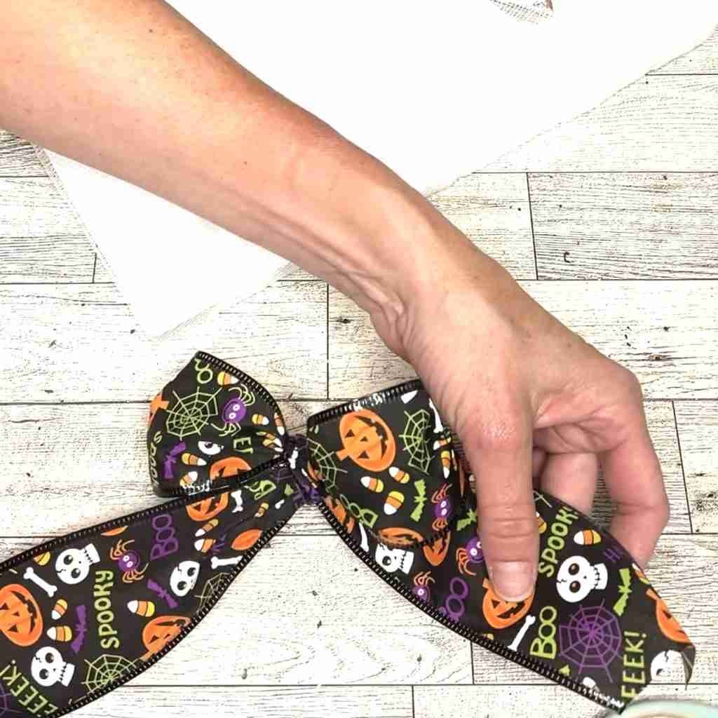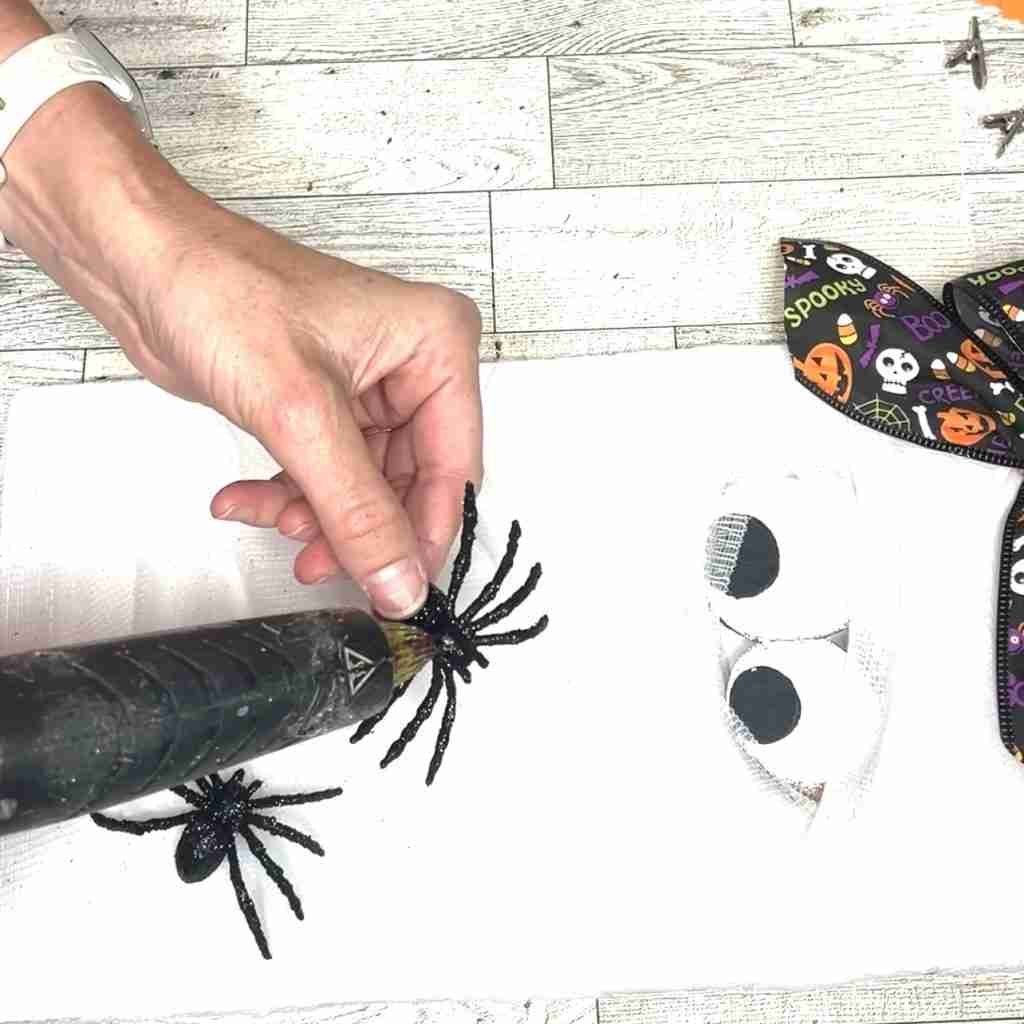 Now we are ready to add a fun Dollar Tree bow and a couple of the plastic spiders!