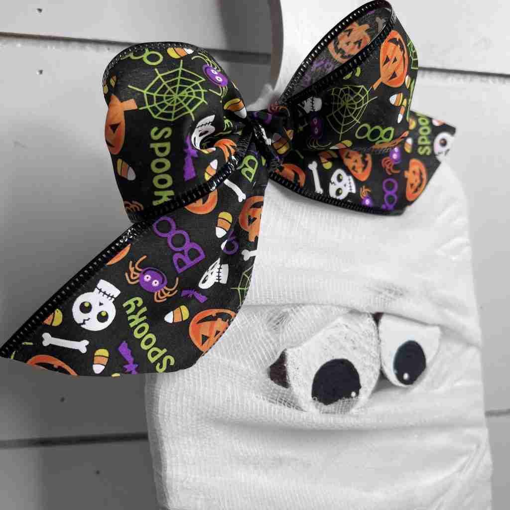 When I spotted this cheeseboard at Dollar Tree I thought it would be perfect for an easy Dollar Tree mummy so I grabbed it, along with the other supplies from Dollar Tree. I’ll be using Dollar Tree ribbon, plastic spiders, and two boxes of gauze.