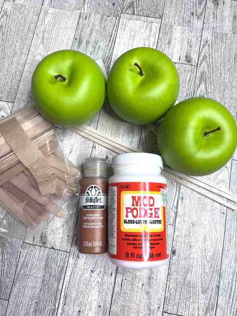 To make the easy faux Dollar Tree caramel apples I’ll be using gloss Mod Podge, Folk Art Raw Sienna, popsicle or some other kind of stick, and ribbon.