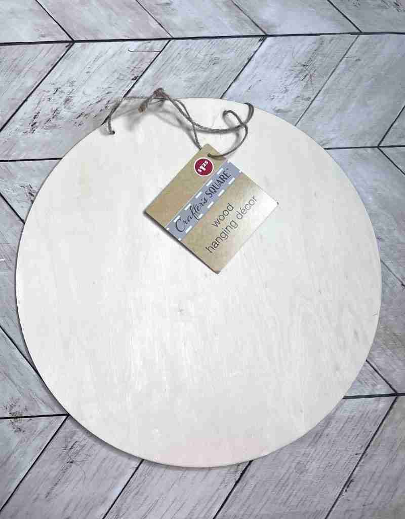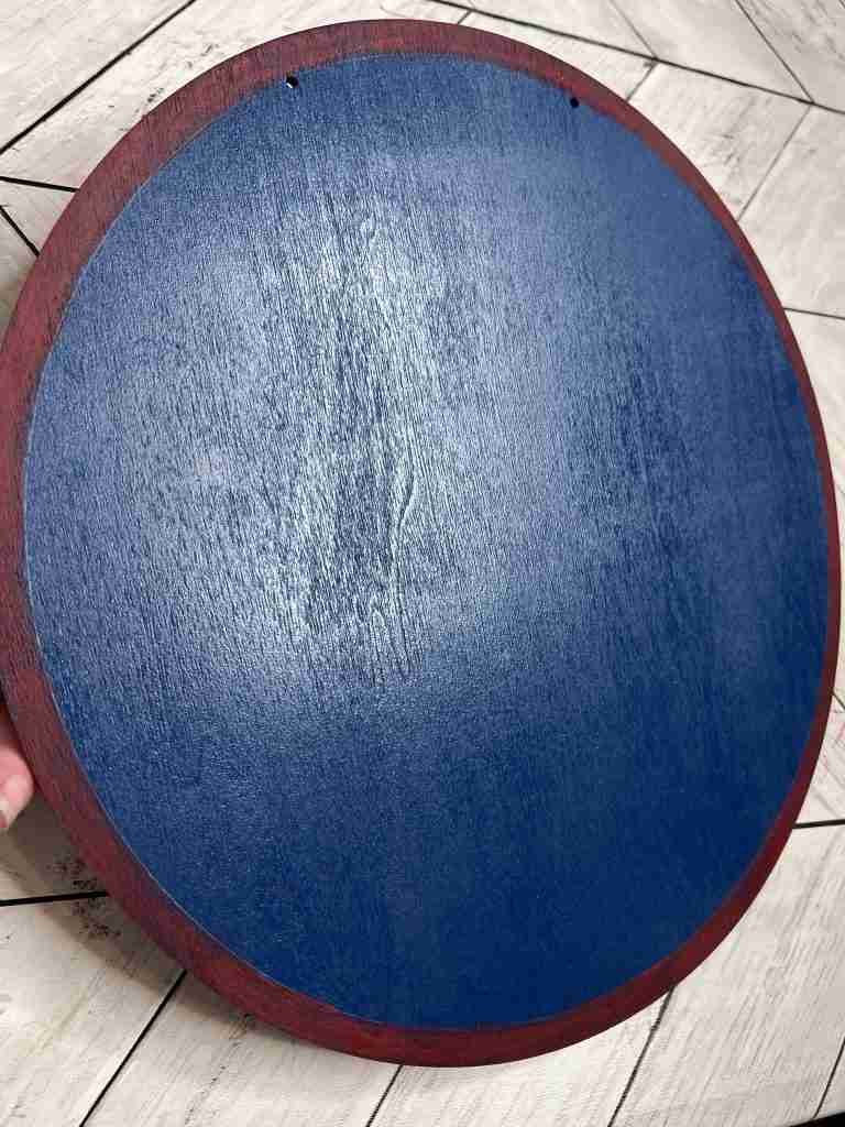 First off, this Dollar Tree wood round can be covered with spray paint or acrylic and I’m choosing to add a coat of this Krylon satin Oxford Blue for a good, quick coverage.