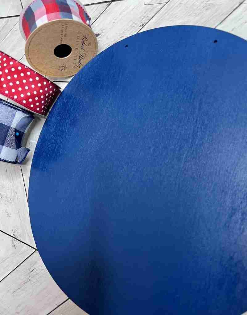 I love patriotic decor that’s easy to put together and I can’t wait to show you this fun patriotic door hanger that combines an inexpensive Dollar Tree round wood hanger with a red, white, and blue twist!