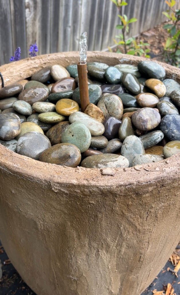 Finally, I added the solar fountain to the bottom of the container and pulled the plastic tubing that comes with the fountain through a piece of copper pipe I had left over from our bathroom remodel. My husband had the idea to add a piece of hard plastic to the top to hold rocks. He added an old plastic pot to the inside of the planter for the plastic shelf to sit on. You can easily just add rocks to the bottom of the planter on top of your fountain mechanics to hold it in place which was my original intent. All in all I love how it turned out and can’t wait for the garden to grow in around it!